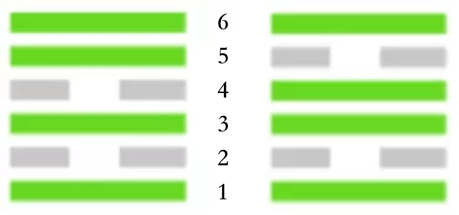 這個卦象由長線(綠色)和短線(灰色)交替組合而成,一共有六行,從上往下代表六絃到一弦。