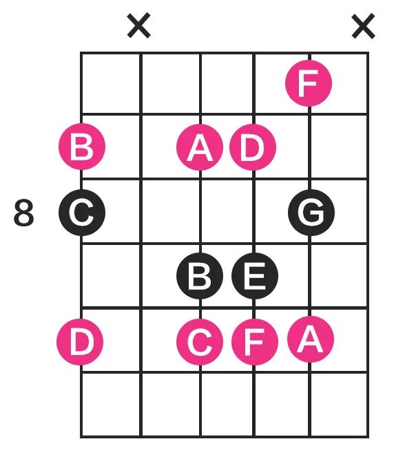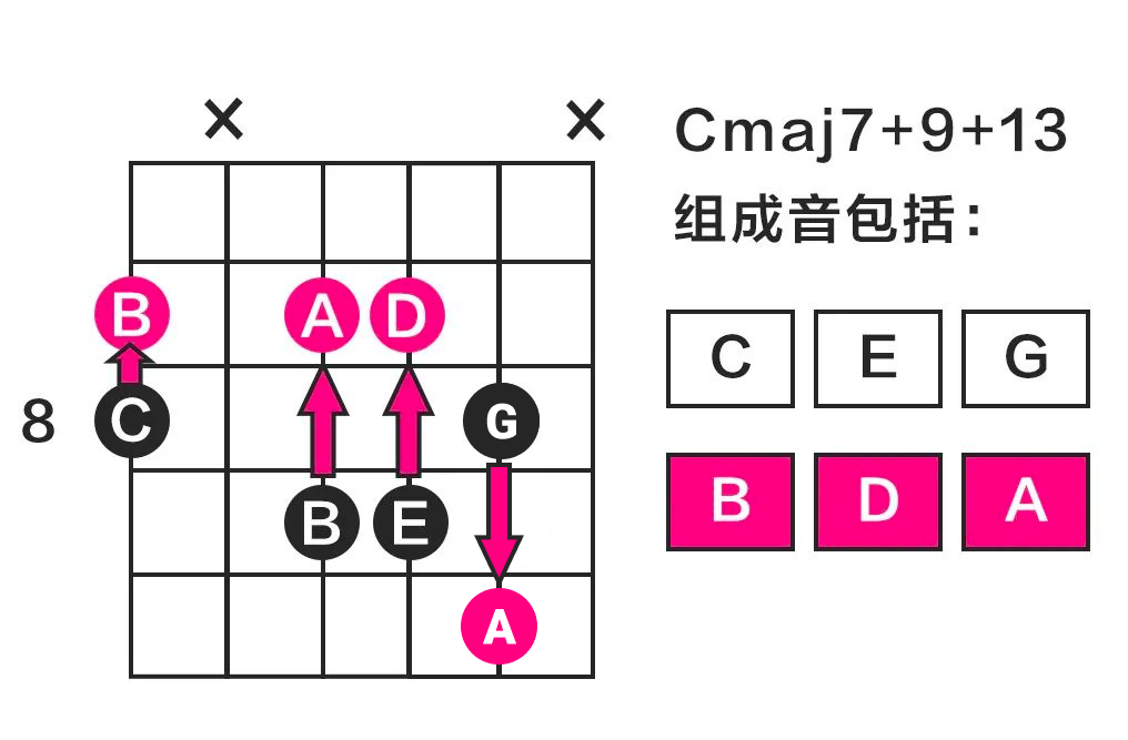**第三步:**我們找一下這個指型下,手指頭旁邊的位置,有哪些Cmaj7組成音(粉色圈圈)