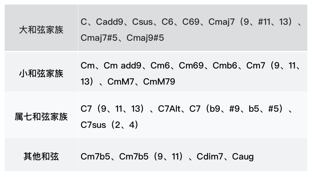 我們可以將爵士和絃分為三個常用的家族:大和絃家族(major)、小和絃家族(minor)、屬七和絃家族(dominant)。剩餘的和絃(減七和絃、半減七和絃、增和絃),我們統一歸類為其他和絃即可。