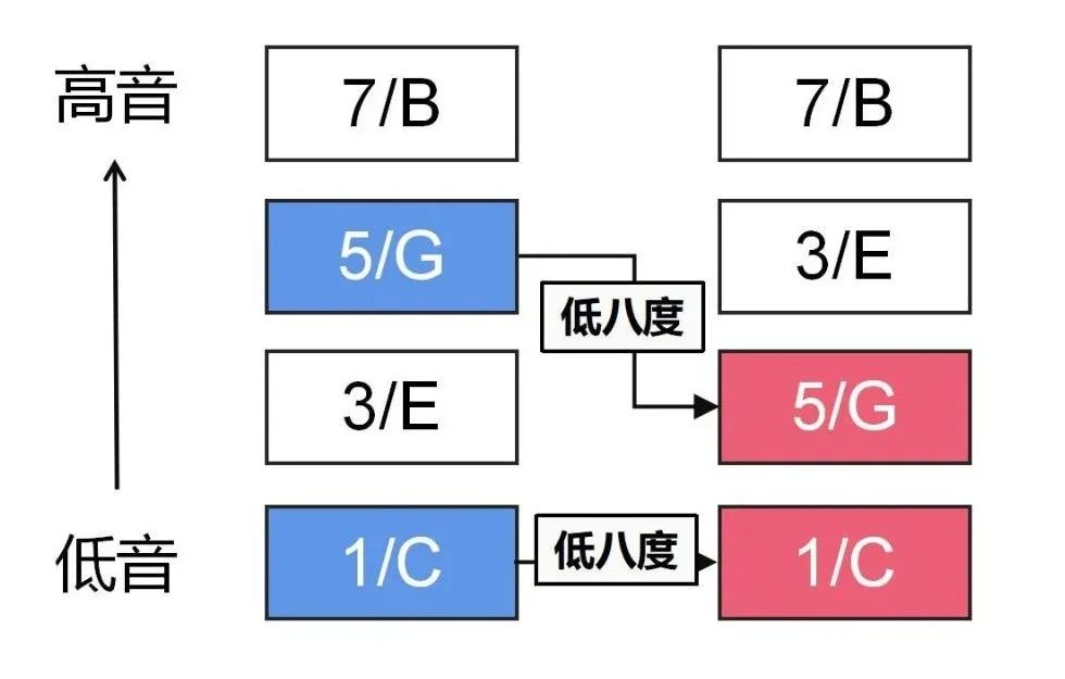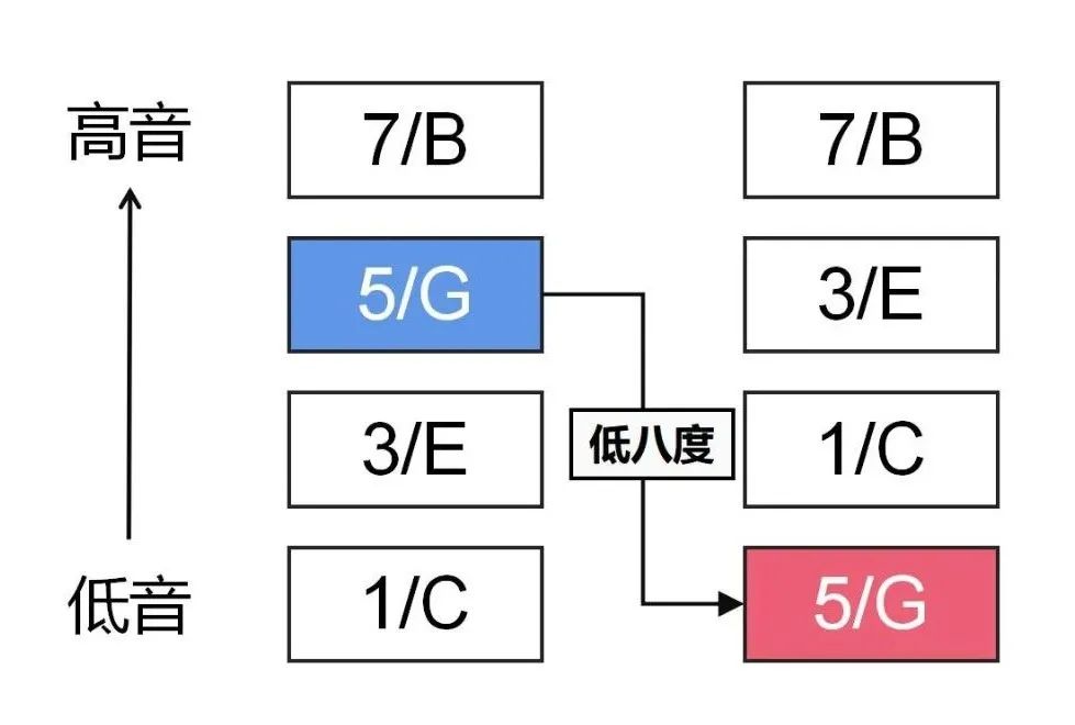 如上圖所示,把第二高的5音G,降一個八度,成為最低音。
