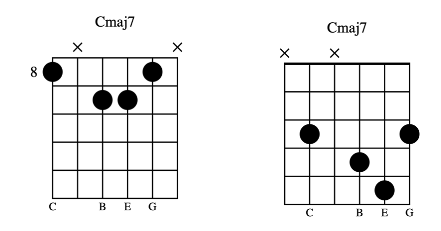 下面是常用的Drop和絃指型,而且最低音皆為和絃根音。圖中是以Cmaj7為例,我們在使用時,只需要以根音為座標,把指型平移過去,就是想要的和絃啦!