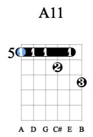 而同樣是A11和絃,按照暗黑吉他界的按法,音符排列則是1-4-5-b7-2