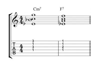 比如下圖的Cm7的Drop2和絃,轉換到F7和絃,保留相同的音,其他音僅進行小幅移動。