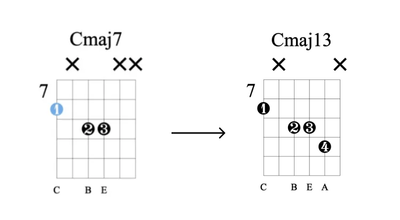 比如在Cmaj7和絃的基礎上,加入13音(A)作為延伸音(這一招在殼式和絃的基礎上特別好使)。