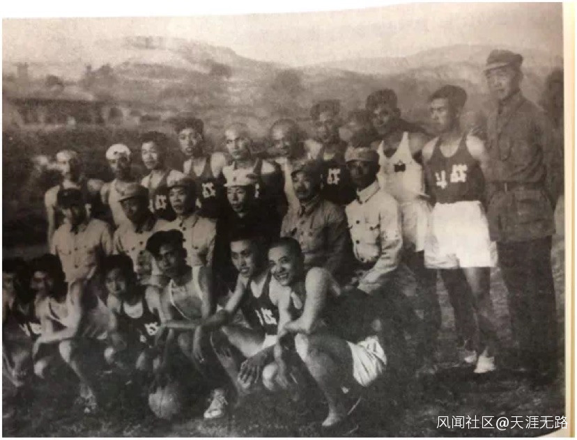賀龍與第120師“戰鬥”籃球隊合影。二排右起:張學思、賀龍、續範亭、周士第、林楓。圖片刊於《星火燎原》。