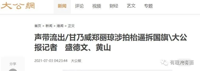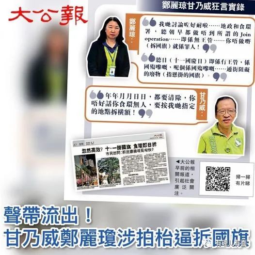 報道源自一段網上流傳的錄音,內容是聲音酷似港島中西區區議會主席鄭麗瓊、區議員甘乃威兩名亂港派區議員,在去年國慶前夕的區議會上拍桌子,脅迫食環署、路政署等部門,命令式要求拆除街道的國旗和愛國橫幅,兩人不但出言侮辱國旗,還誣衊“7.1”、“10.1”等日子是“國殤日”,該事件導致去年國慶節多處懸掛在街上的國旗遭兩署人員拆除,令愛國市民十分氣憤。