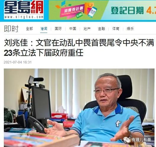 全國港澳研究會副會長劉兆佳在接受媒體採訪時表示:“那些文官在過去的動亂中令人覺得謹小慎微、畏首畏尾,這件事在中央眼內非常不滿,包括部分愛國人士也沒負起其應盡的責任,但唯一一個仍能令中央對香港可以放心的就是香港警察隊伍及其他紀律部隊的工作表現,令中央覺得港人治港、高度自治尚有可為。”