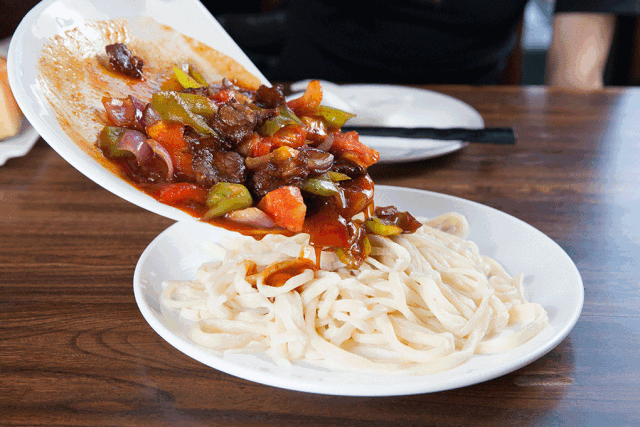 出鍋後的配菜自成一碟,和一盤拉條子同時端上桌,把菜全部倒在拉條子表面,拌勻後的拉條子和配菜混為一體,香氣四散。