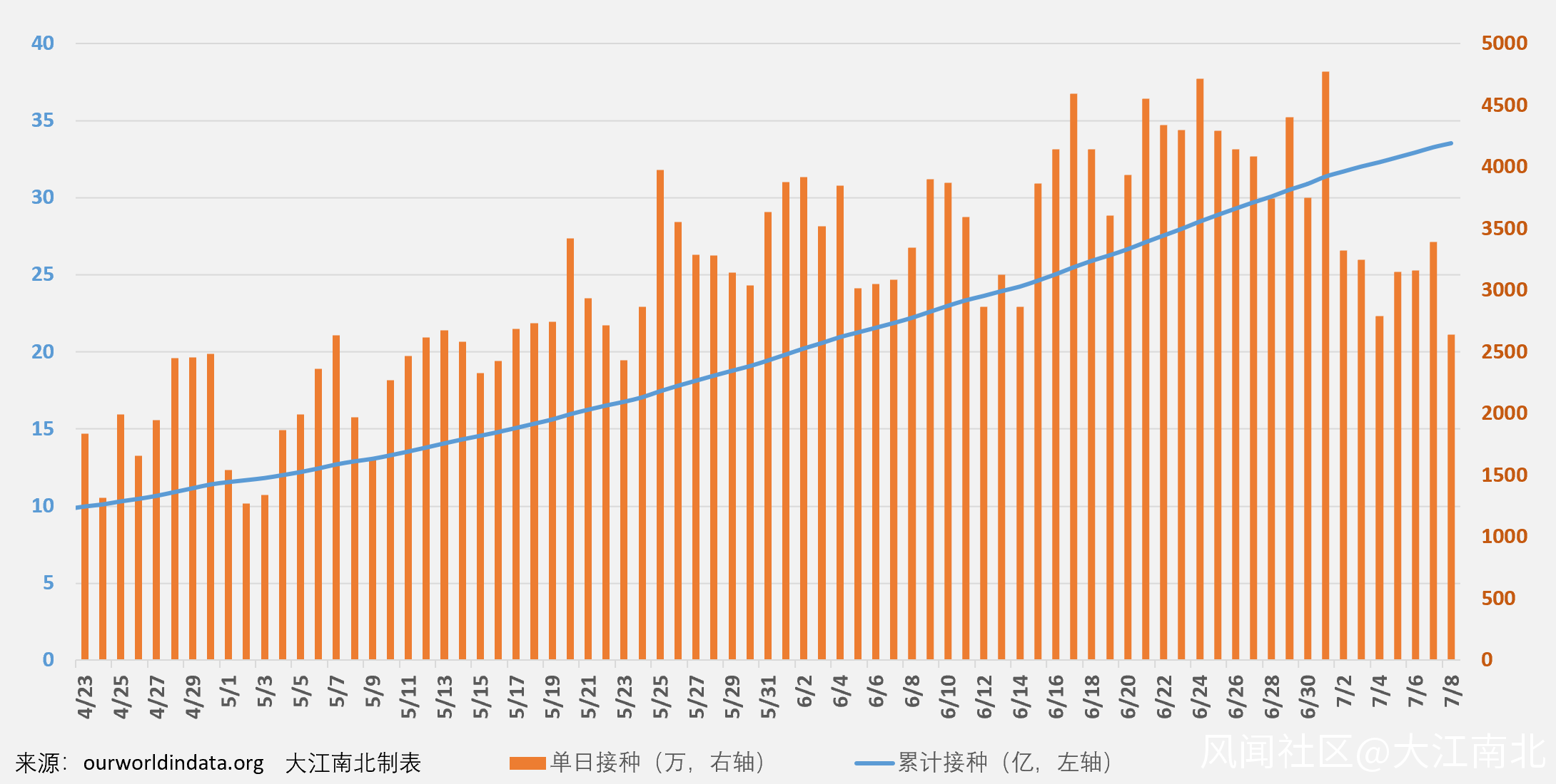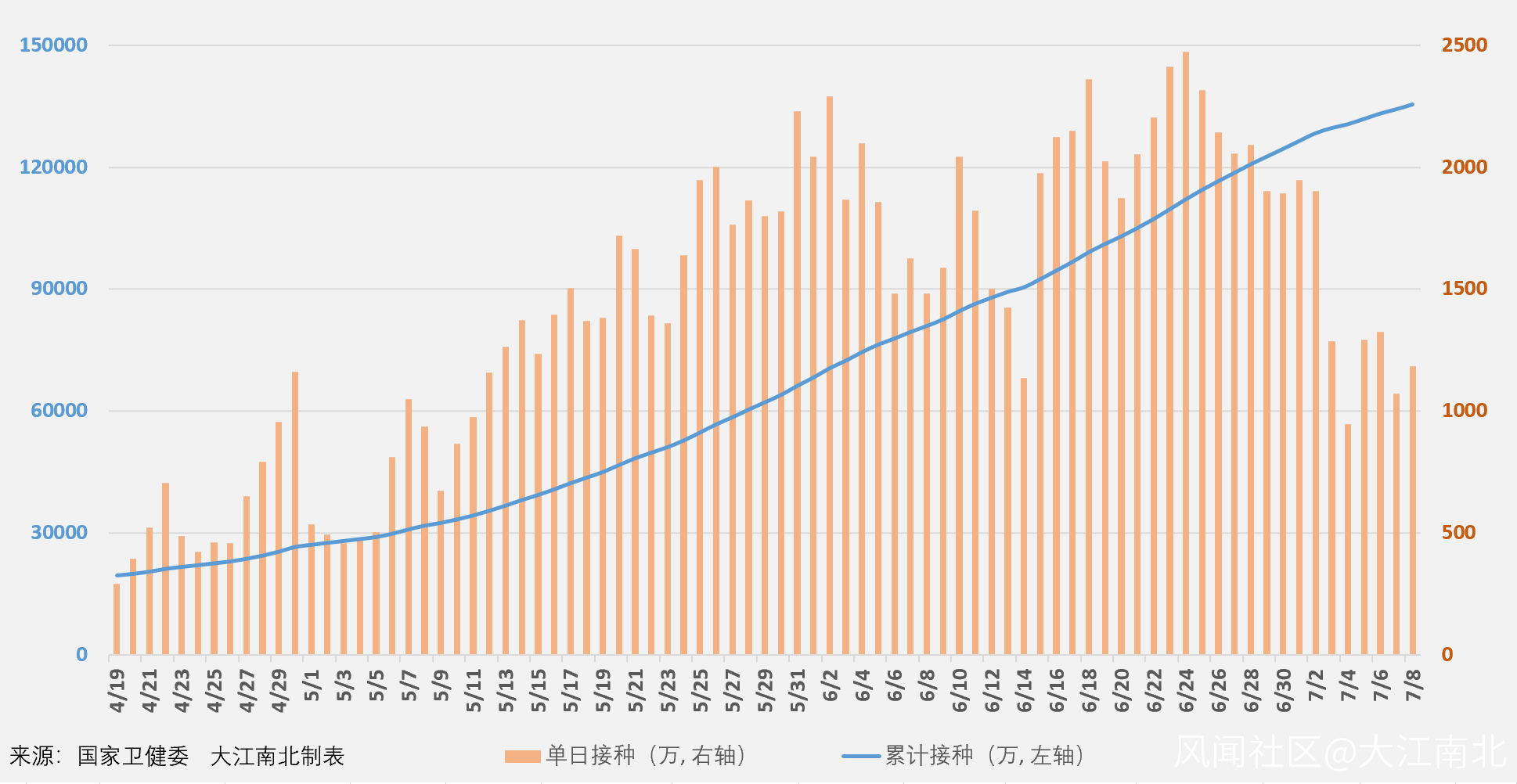 截止2021年7月8日,中國大陸累計接種新冠疫苗13.542億劑,繼續位居全球第一位,佔全球累計接種劑數的40.4%;其中單日新增接種1185萬劑,佔全球單日接種劑數的44.8%。我國自3月23日以來,日均接種1179萬劑。中國每百人累計接種94.08劑,環比增加0.83劑。