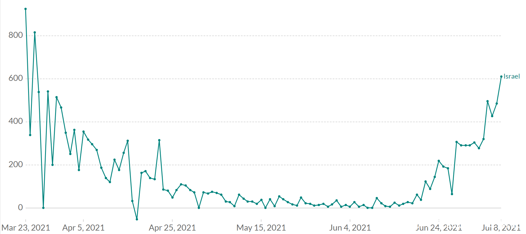 截止2021年7月8日,印度累計接種3.617****億劑,列第二位,**其中單日新增接種362萬劑。**印度至少接種一劑的人羣佔比為21.3%,完成接種的人羣佔比為4.9%。印度每百人累計接種26.21劑,是中國的27.9%。自3月23日以來,印度日均接種290萬劑,繼續緩慢增加,為中國同期日均接種數的24.6%。