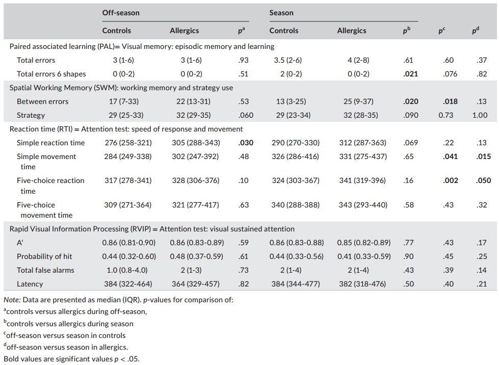 研究發現,空間工作記憶中認知功能受損,過敏組與非過敏組相比產生的錯誤更多,但是在非花粉季節時兩組之間沒有差異。在視覺記憶或者注意力的其他測試中,研究人員沒有發現過敏組和對照組之間存在顯著差異。健康質量調查問卷表明過敏組症狀更多且生活質量受損。花粉季節時,過敏組中更多的症狀與簡單運動更長的反應時間相關。另外,沒有發現應激或者炎症標記在兩組之間的差異。