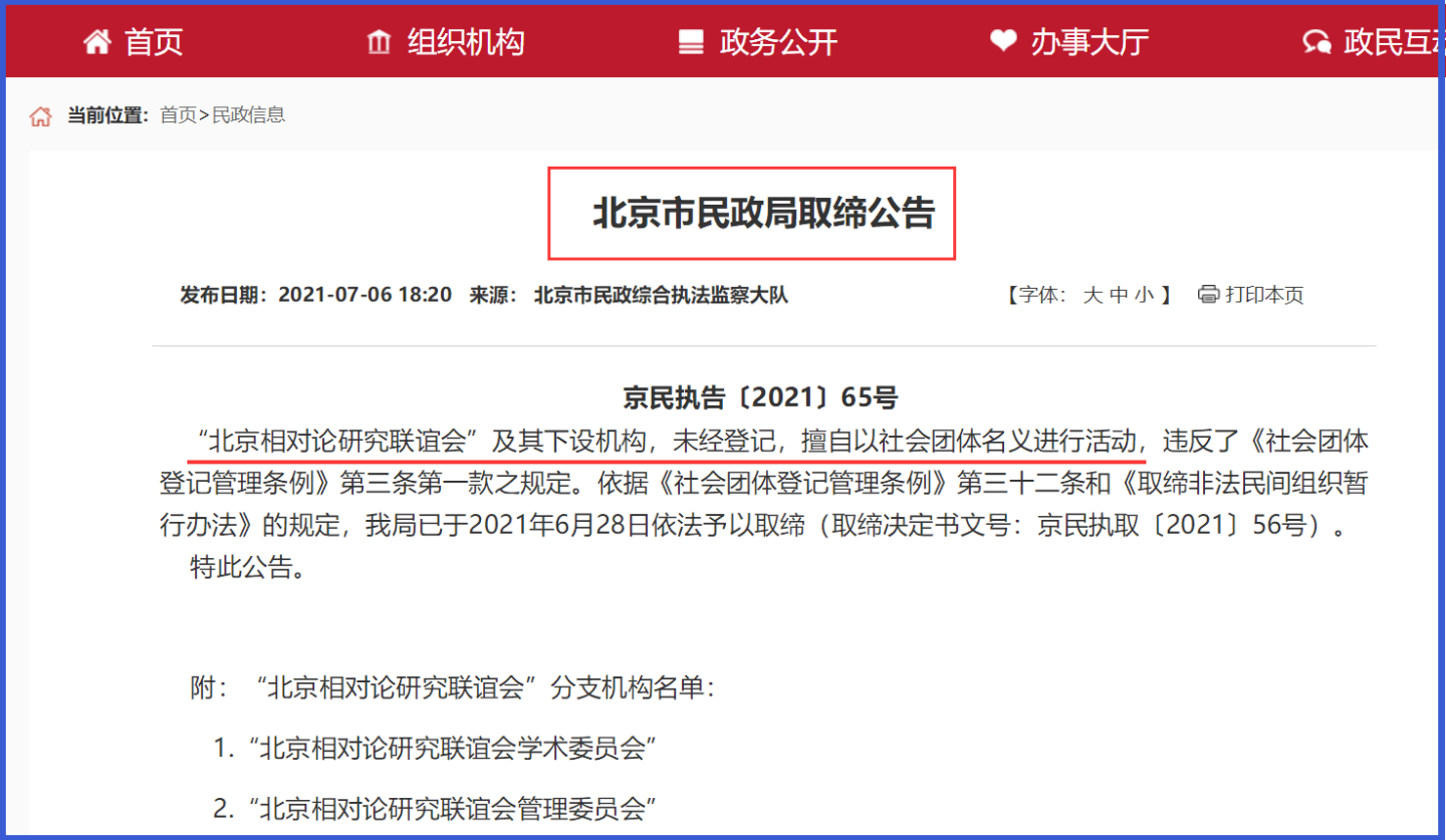 經過調查詢問、現場檢查、調取資料和網絡核查等多方取證,北京市民政局認定“北京相對論研究聯誼會”及其分支機構為非法社會組織。6月30日,北京市民政局執法人員向其負責人送達了取締決定書,並責令停止一切非法活動。