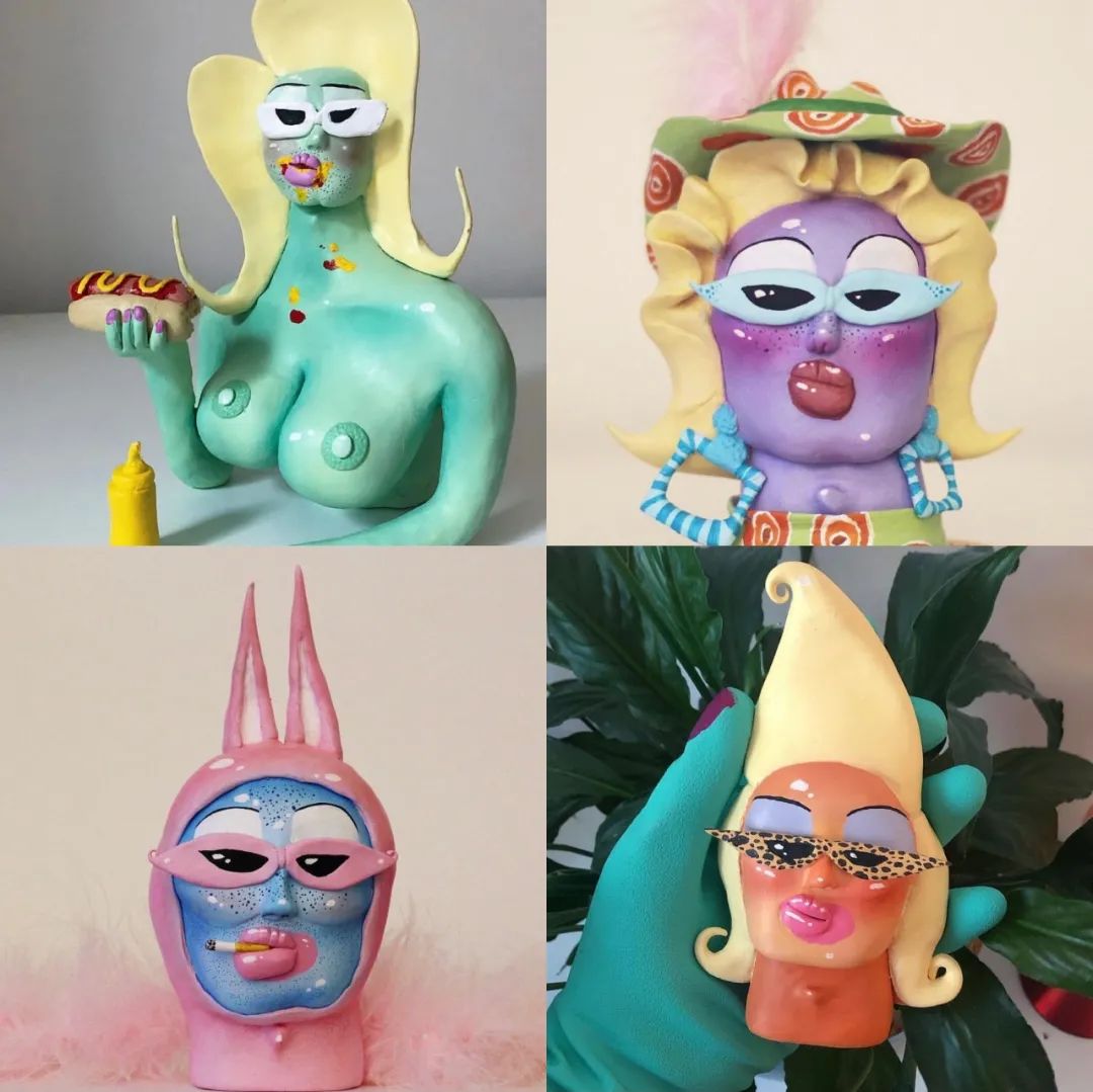 她還創作了一些泥塑形象,一個個簡直是自己的翻版。