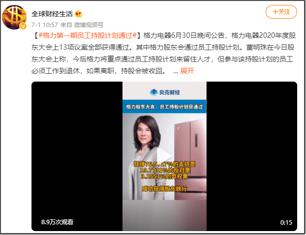 先是6月30號下午,格力舉行了2020年度股東大會。在股東大會上,格力一共通過審議了13項議案,其中就包括之前一直備受爭議的格力第一期員工持股計劃。