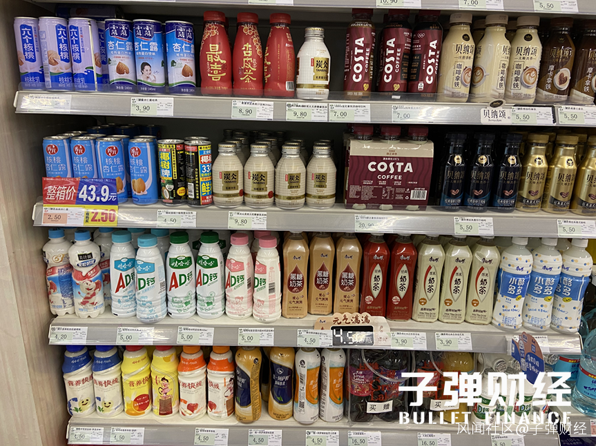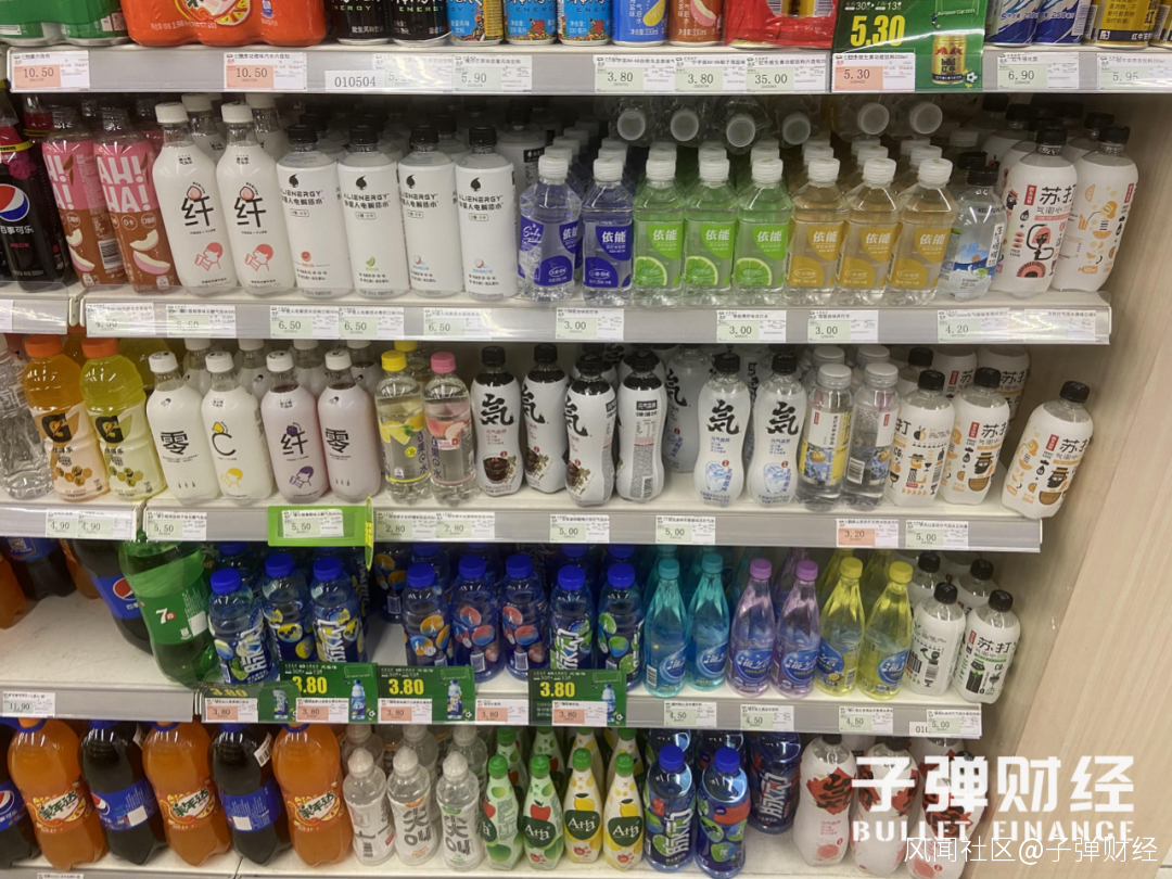 「子彈財經」在北京市朝陽區內一些傳統商超內看到,元氣森林、喜小茶等新興品牌在貨架上佔據不少陳列位,與農夫山泉、可口可樂等傳統品牌的氣泡水分庭抗禮。