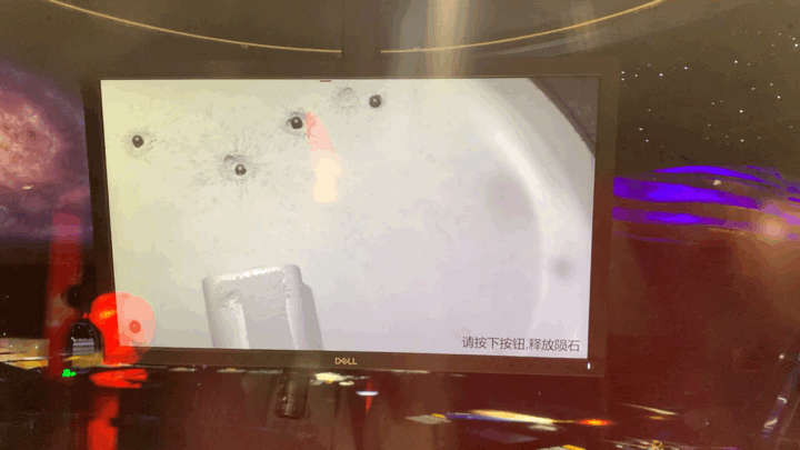 隕石展區同樣有着趣味十足的互動設備。你可以親自嘗試鑑別隕石,通過移動操作杆在幾塊其貌不揚的石頭中找出真正的天外來客。隕石展櫃旁邊的玻璃櫃裏,還簡單地模擬了隕石的撞擊。按一下按鈕,頂上就會掉下一個小鐵球,砸到下方的麪粉裏留下“隕石坑”,上方的屏幕還會慢放小球砸在麪粉上的過程。