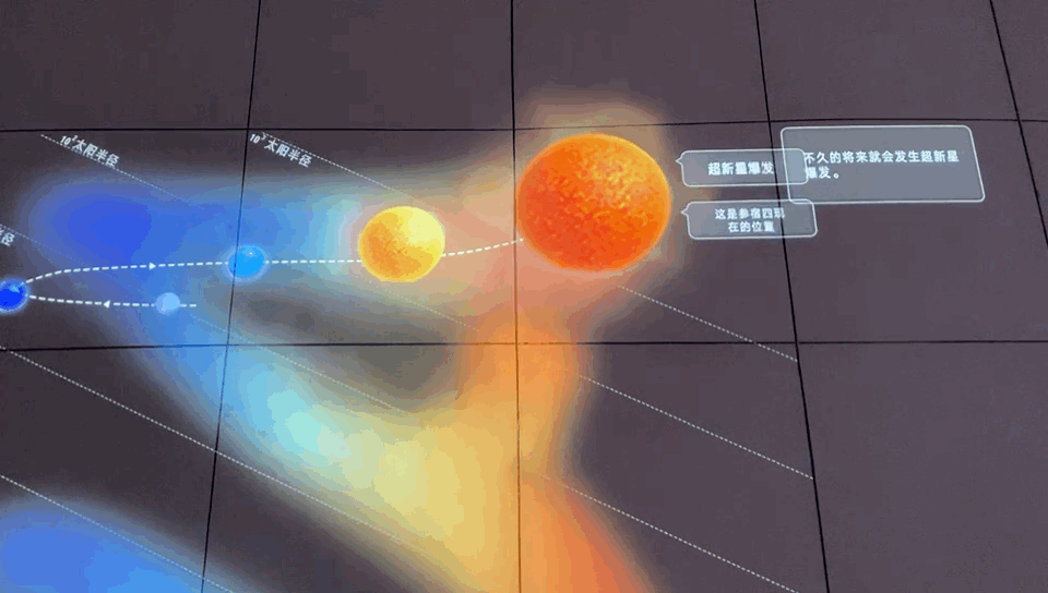 像太陽這樣的恆星,是如何誕生,又最終會如何衰亡?赫羅圖會滿足你的想象。在屏幕上任意選擇一顆恆星,牆壁上的赫羅圖投影會出現恆星從形成到膨脹再到最後坍縮的整個生命週期。當一顆恆星以超新星爆發結束自己的生命,那將是宇宙中最為明亮壯觀的景象。