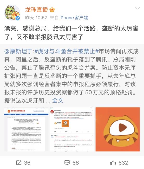 當虎牙和鬥魚合併被禁止的消息傳出來之後,龍珠直播馬上就拍手稱快道:漂亮,感謝總局,給我們一個活路,壟斷的(得)太厲害了,又不敢舉報騰訊太厲害了。
