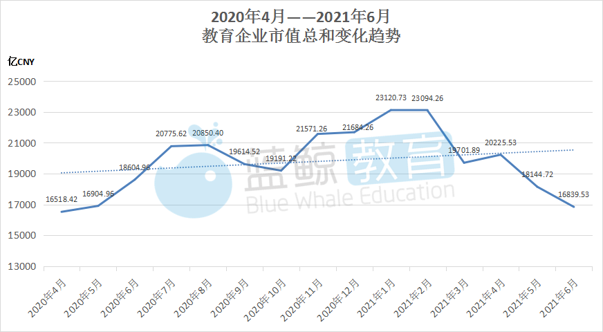 從2020年4月末至今,教育行業市值整體來看波動較為明顯。下圖是2020年第二季度初到2021年6月末,教育大盤總市值趨勢: