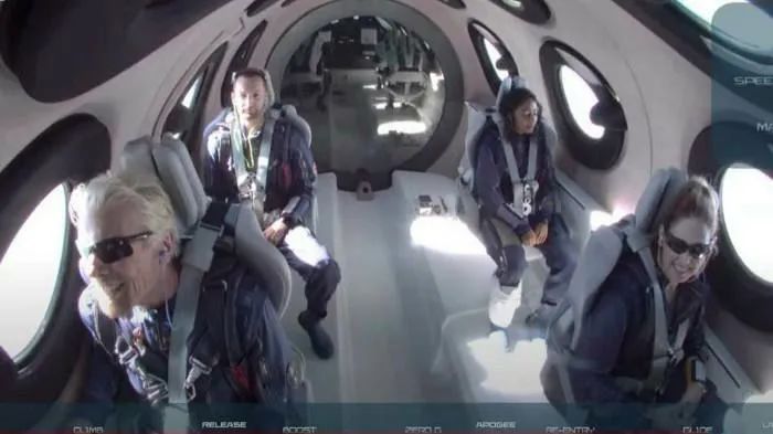有四分鐘的時間,可以讓布蘭森和其他機組人員體驗太空失重感。他們解開安全帶,準備好好凝望那顆藍色星球。這時,飛船正升到 53 英里,進入亞軌道飛行狀態。