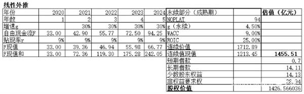 按照這個推算,我們就假設5年後開始永續增長(實際上不可能),現值顯然並不高。