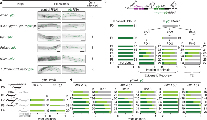 a含有相同gfp序列的六個靶基因暴露於相同來源的對照 RNAi 或gfp RNAi。P0 動物被餵食 dsRNA 24 小時,並分析了 P0 動物及其最多五代(F1-F5)未經處理的後代。代表性圖像突出了 P0 動物的生殖系(綠色輪廓)。指示了顯示沉默的後代的數量。請注意,sun-1::gfp**var也存在於具有PH::gfp的動物中,但並未沉默,因為其gfp**var序列與用於餵養 RNAi的gfp -dsRNA僅具有 <14-nt 的連續同源性。比例尺表示 50 µm。乙表達T 的P0 動物暴露於對照 RNAi(P0 對照 RNAi)或gfp-dsRNA(P0 gfp RNAi)24 小時,並在 P0 動物及其未處理的後代中分析沉默。在gfp RNAi 中,P0 和 F1 動物都被彙集在一起進行成像,但每個從一個 P0 祖先(P0-1、P0-2 或 P0-3)下降的後代被成像為單獨的分離物。顯示的所有世代均通過成像評分,但 F2s 除外,其通過眼睛評分。雖然一個分離株顯示了 TEI,但其他兩個分離株恢復了表達(表觀遺傳恢復)。如示意圖所示,gfp dsRNA的序列與gfp編碼序列的外顯子相匹配。c gtbp-1::gfp動物被餵食gfp -dsRNA(黑色)連續一、二或三代,並且它們在野生型(eri-1(+))或eri-1(-)背景中未經處理的後代(灰色)被評分為表達綠色熒光蛋白。d gtbp-1::gfp野生型(met-2(+)和heri-1(+))、met-2(-)或heri-1(-)背景中的gtbp-1::gfp雌雄同體被餵食gfp- dsRNA 24 小時和未處理的後代(F1-F7)的評分如補充圖8c所示 。同時進行其他菌株的 RNAi 餵養,因此gtbp-1::gfp 的數據此處與補充圖8c 中的相同 。在heri-1(-)動物中,P0 和 F1-F2 之間的統計差異是由於沉默增加,但 P0 和 F3-F7 之間的統計差異是由於沉默減少。大多數餵食對照 RNAi 和後代的動物都顯示出明亮的 GFP 表達(除了 45 只 F5 後代中的 2 只和heri-1(-)動物的 37 只 F7 後代中的 1只顯示暗淡表達)。指出了評分的動物數量 ( n )。星號表示 使用χ**2檢驗P < 0.05 。另見補充圖 8。源數據作為源數據文件提供。