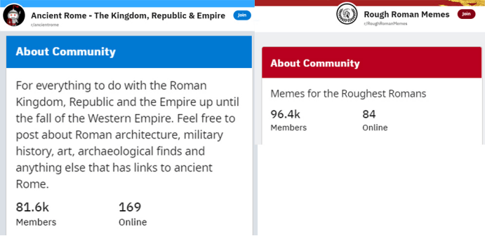 至於西方網絡上的羅馬相關的“梗”,更是隨着網絡時代的發展而層出不窮,如Reddit論壇上,比較著名的是玩梗的r/RoughRomanMeme板塊以及正經討論的r/AncientRome板塊兩個羅馬相關的板塊。但是從數量上看,更勝一籌的顯然是玩梗的“精羅”網友。