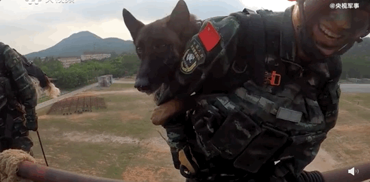 但驚慌終究只是暫時的,在順利落地後,軍犬也沒有給自己的戰友拖後腿。