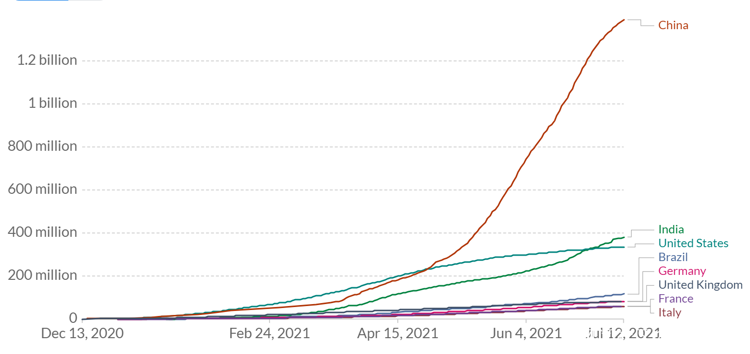 截止2021年7月12日,中國大陸累計接種新冠疫苗13.914億劑,繼續位居全球第一位,佔全球累計接種劑數的40.1%;其中單日新增接種895萬劑,持續在低位徘徊,佔全球單日接種劑數的35.8%。我國自3月23日以來,日均接種1171萬劑。中國每百人累計接種96.66劑,環比增加0.62劑。