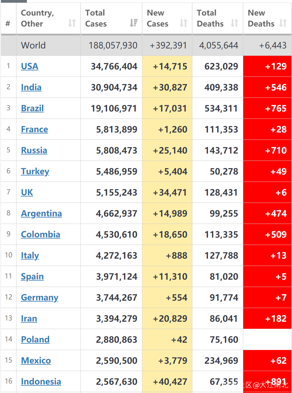 中國周邊國家形勢急劇惡化:印尼新增40,427例,首次突破4萬例大關,全球排名第一,新增病亡891例,全球排名第一;菲律賓新增5,199例;**日本新增2,092例,多國奧運隊已出現感染病例;**馬來西亞新增8,574例;尼泊爾新增1,690例;泰國新增8,656例;緬甸新增5,014例,再創歷史新高;韓國新增1,100例;蒙古新增1,496例;柬埔寨新增911例;越南新增2,383例,再創歷史新高。