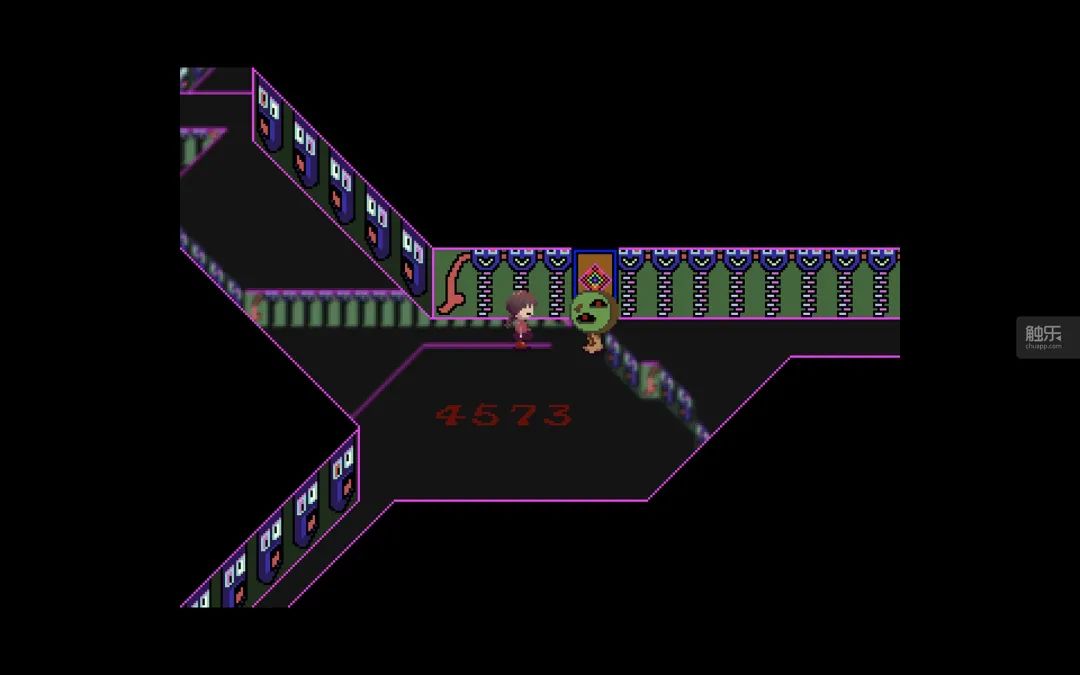 美術和音樂就更給玩家的心靈帶來直接衝擊。不同於如今一些精緻的16-Bit風格仿古像素遊戲和極度簡潔的《傳説之下》(Undertale),《夢日記》的美術表達更加隨心所欲。畫面中不少元素都採用了極其鮮豔的色彩搭配,配合畫圖軟件笨拙而稚嫩的筆觸。這似乎讓我們看到了“壞繪畫藝術”(Bad Painting)在數字時代的影子——作者故意選擇這種看似潦草的美術風格,其實讓遊戲神經質而獨特的自我表達得到了實現。古怪而令人難忘的背景和角色讓任何一個接觸過《夢日記》的人都很難將這些形象從大腦中清除。