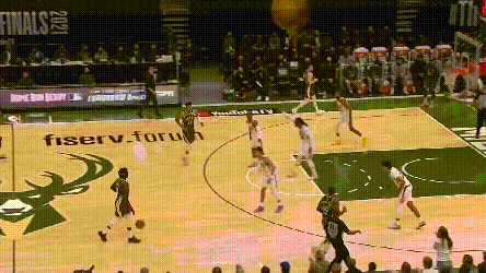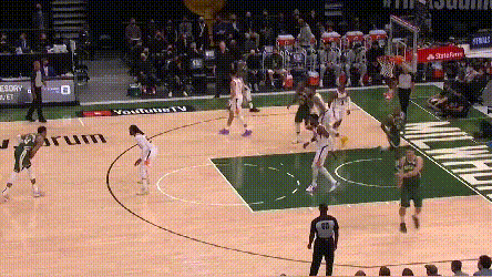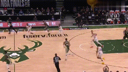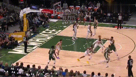於是太陽又改聯防,結果聯防本來的弱點罰球線附近,又剛好是中路封堵字母的關隘,太陽不得不在這加兵力,籃下被空切打穿。