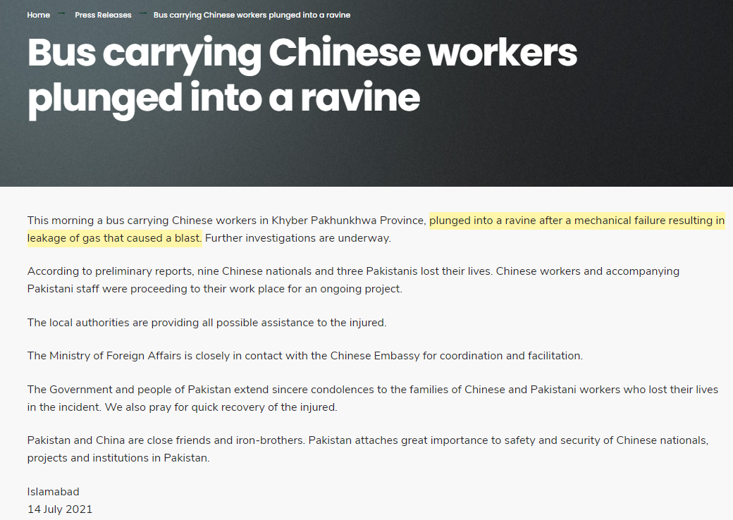 14日下午,巴基斯坦外交部在網站上發佈一則公告表示,一輛載有中國工人的班車今天早晨在開伯爾-普圖什省由於機械故障,導致氣體泄漏,引發爆炸,最終墜入河谷,進一步的調查正在進行中。
