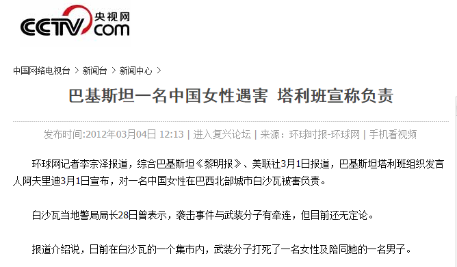 2012年2月28日,一名中國女子在巴基斯坦西北部城市白沙瓦遭槍殺,巴基斯坦塔利班組織發言人阿夫裏迪3月1日宣佈,對這起事件負責。