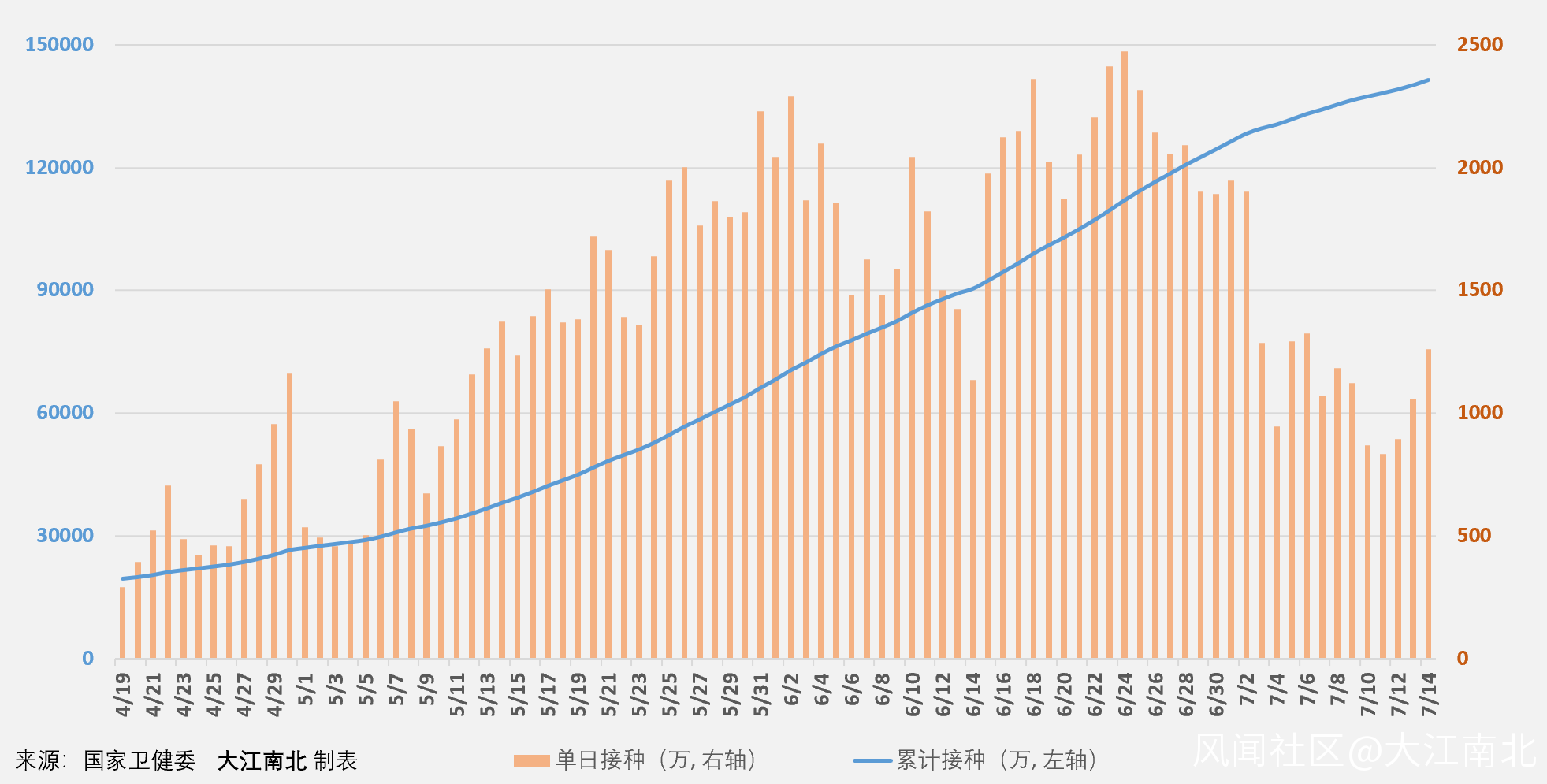 截止2021年7月14日,中國大陸累計接種新冠疫苗14.146億劑,繼續位居全球第一位,佔全球累計接種劑數的40.0%;其中單日新增接種1259萬劑,小幅反彈,佔全球單日接種劑數的40.6%。我國自3月23日以來,日均接種1170萬劑。中國每百人累計接種98.27劑,環比增加0.87劑。