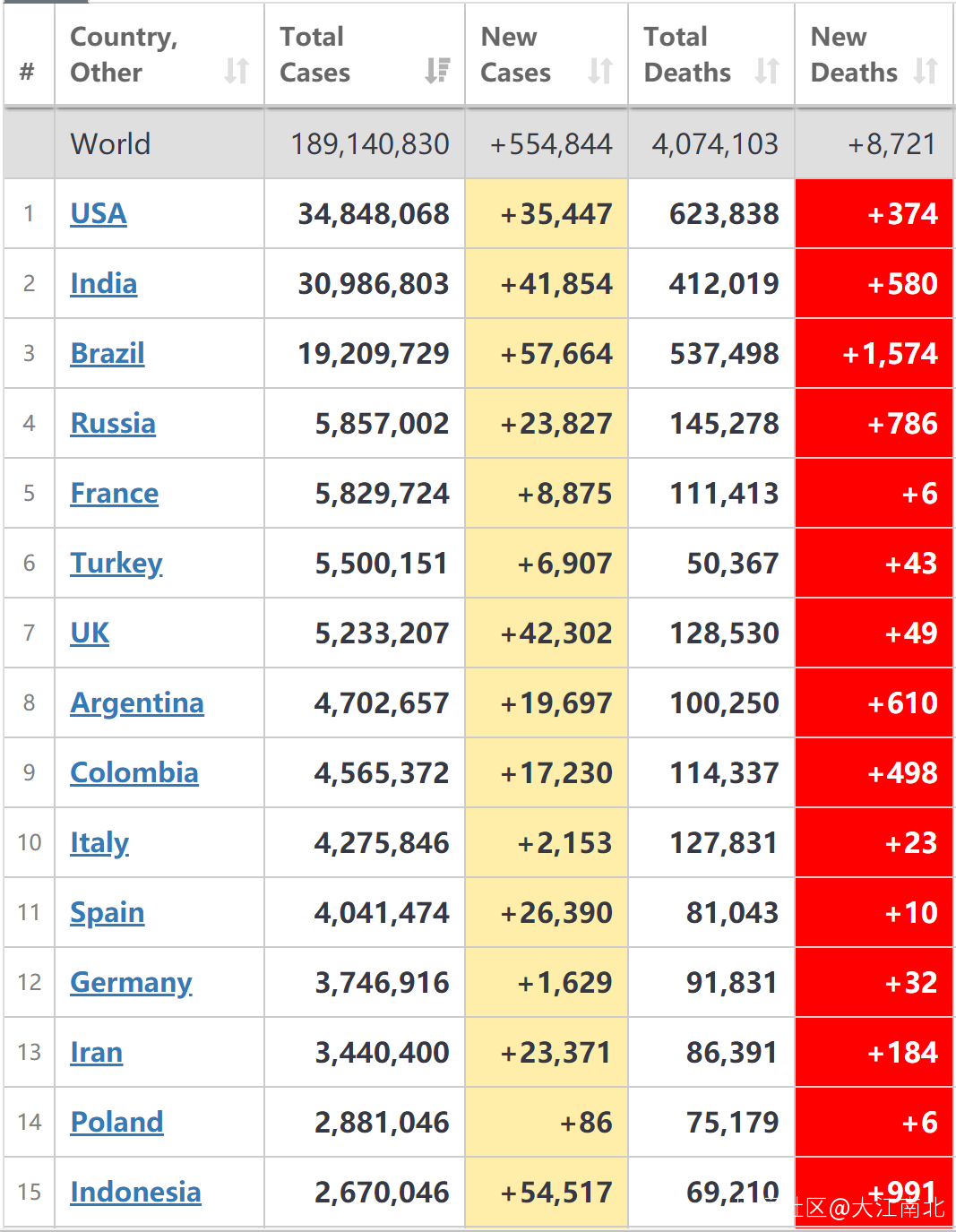 7月14日,**全球新增新冠確診554,844例,創5月27日以來新高;**累計確診1.8914億例;新增病亡8,721例;累計病亡407.41萬例。
