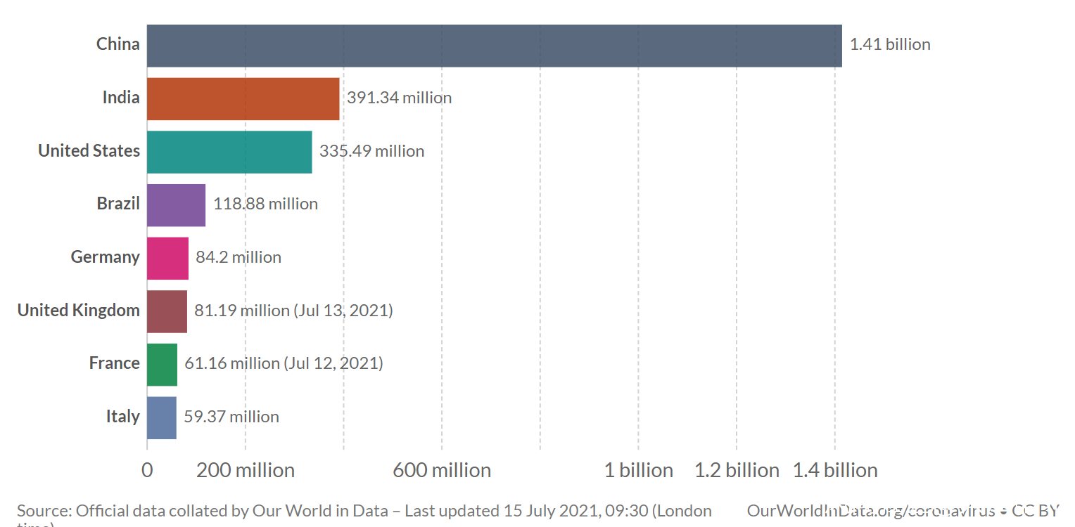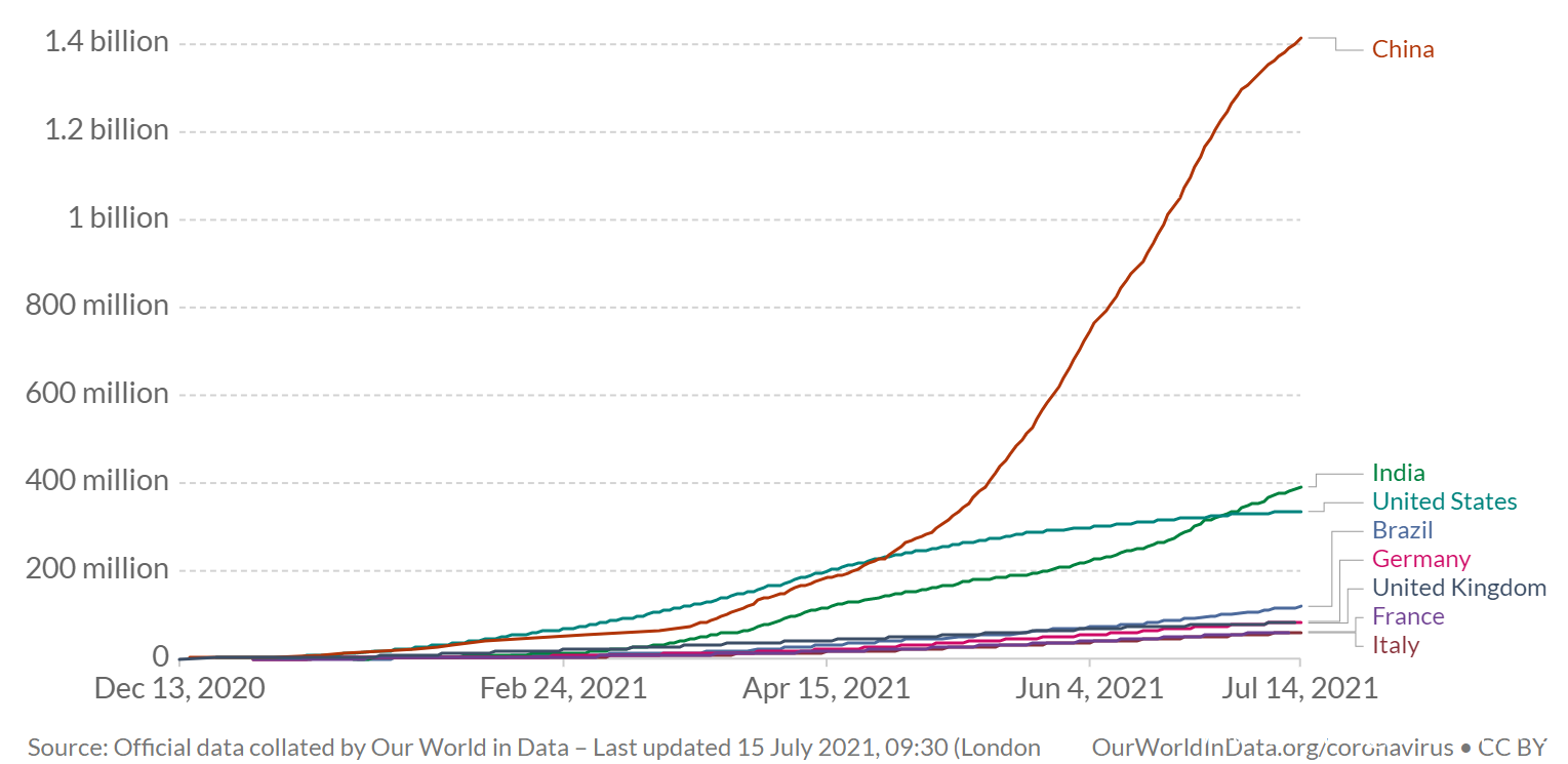 截止2021年7月14日,印度累計接種3.913****億劑,列第二位,**其中單日新增接種364萬劑。**印度至少接種一劑的人羣佔比為22.7%,完成接種的人羣佔比為5.6%。印度每百人累計接種28.36劑,是中國的28.9%。自3月23日以來,印度日均接種301萬劑,為中國同期日均接種數的25.7%。