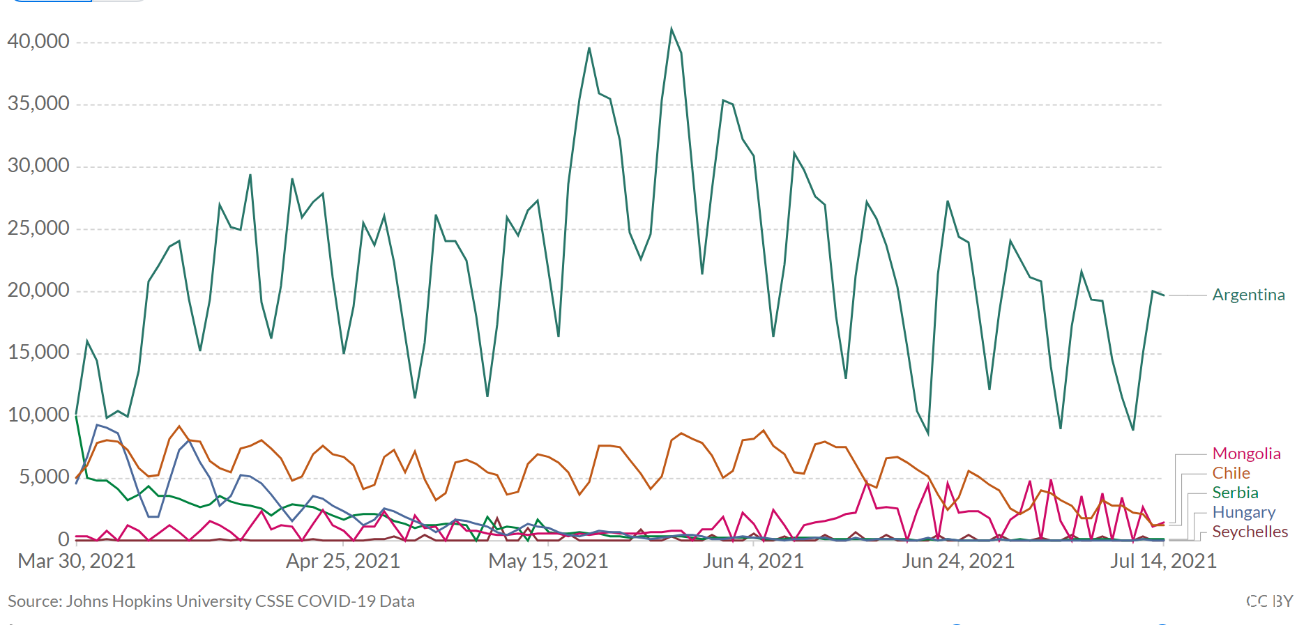 看了一下接種中國滅活疫苗的幾個國家的疫情,除了阿聯酋的數據很奇怪,塞爾維亞、匈牙利、智利、塞舌爾都大幅度下降了,蒙古、阿根廷的下降趨勢也很明顯,説明中國疫苗的作用顯著。