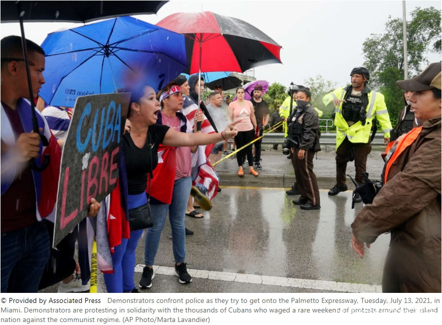 週二在邁阿密、坦帕和奧蘭多的示威者暫時封鎖了繁忙的道路,高呼支持週日走上共產主義國家街頭表達對經濟狀況不佳和其他問題的不滿的古巴人。
