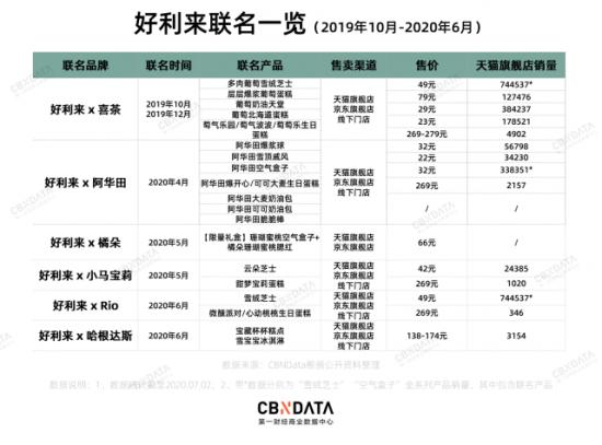 據CBNData消費站報道,截至2020年7月2日,半年多時間裏好利來已經和6個品牌/IP推出20多款聯名新品。其中不光有喜茶、阿華田、Rio等食品飲料品牌,還有動畫IP小馬寶莉,美妝品牌橘朵。“琥珀消研社”日前還發現,今年還多了和泡泡瑪特、布朗熊、川寧、樂樂茶的聯名。