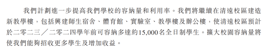 招股書顯示,公司將繼續在清遠校區建造新教學樓,包括興建師生宿舍、體育館、實驗室、教學樓及辦公樓,使預計清遠校區於2023╱2024學年前可容納多達約1.5萬名全日制學生。擴大校園容納量將使學校能夠招收更多學生及增加公司的收益。