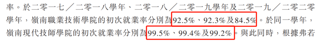 一方面,初次就業率在下滑。華南職業教育集團招股書數據顯示,2017╱2018學年、2018╱2019學年及2019╱2020學年,嶺南現代技師學院的初次就業率分別為99.5%、99.4%及99.2%,同期,嶺南職業技術學院的初次就業率分別為92.5%、92.3%及84.5%。四年間,嶺南職業技術學院的初次就業率下滑了12.6個百分點。