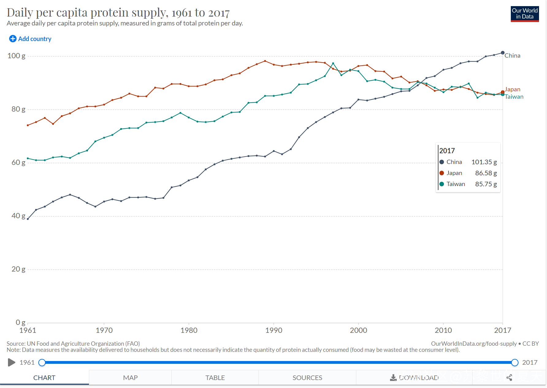 *全球人均每日蛋白質消費量數據 https://ourworldindata.org/grapher/daily-per-capita-protein-supply