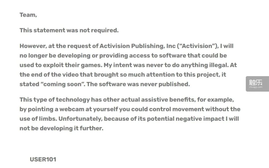 在這條公告中,User101表示應動視公司要求,將不再開發或發佈可能損害公司利益的軟件。他還特意説明,雖然引發了大量關注,但是他從來沒有發佈過宣傳片中的作弊軟件。