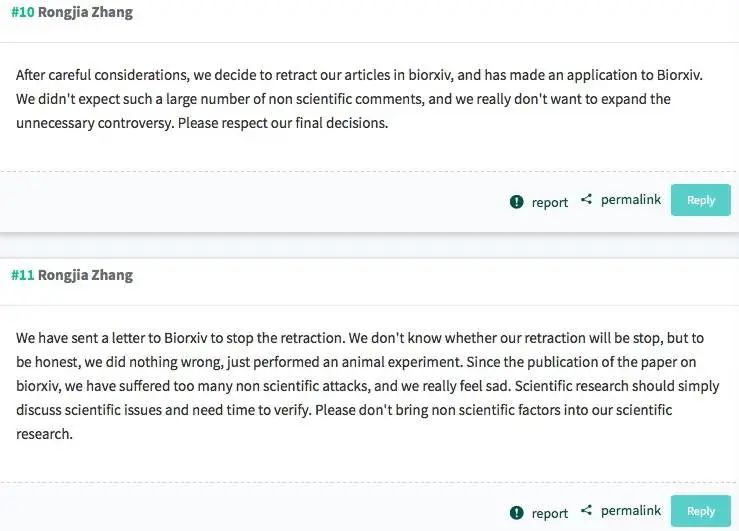 洶湧的輿論逼得論文作者張榮佳不得不在學術交流社區PubPeer上多次解釋和回應網友們的質疑,甚至一度向BioRxiv提交了撤稿請求。