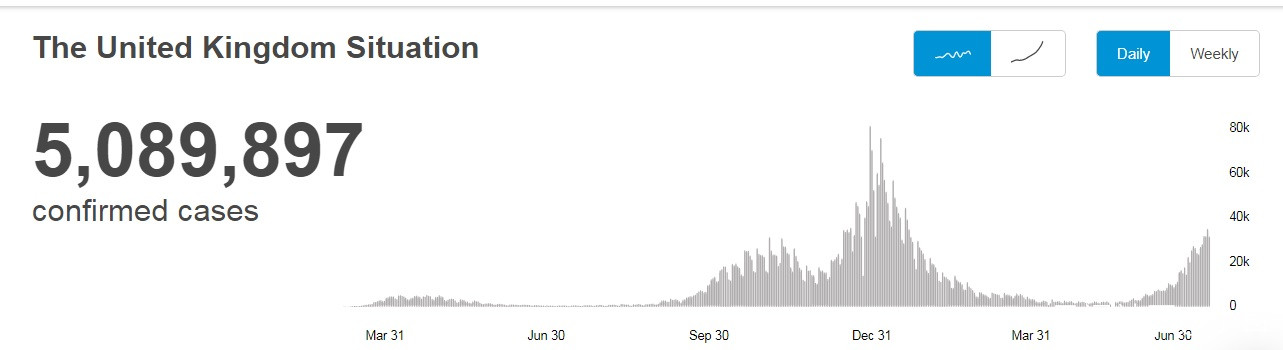 疫苗出來後, 美國疫情本已趨緩到一天幾千個確診, 但在最近由於Delta病毒的流行, 又有抬頭的趨勢。 過去多天已經連續每天超過2萬人確診, 平均超過兩百人左右死亡。 如果考慮到美國只有中國人口的四分之一, 這個數字實際上是非常驚人的。 更不要説源自印度的delta變種已經開始在疫苗接種率不低於美國的它的好跟班英國再次爆發。 考慮到兩國的密切關係, 很可能對美國帶來巨大的威脅。