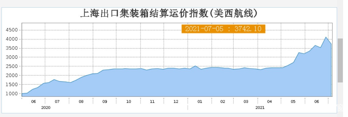 另外, 大家一定注意到, 在最近的幾個月, 由於對美出口旺盛, 由中國至美國的航運價格飛漲,比如, 由世界第一大港上海到美國西海岸的出口集裝箱運價從去年六月份至今就已經漲了超過2.5倍, 一度超過3倍! 結果是現在全中國一個集裝箱難求!