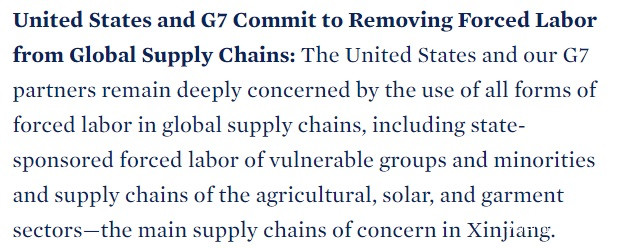 該聲明毫無證據地污衊新疆的農業, 太陽能和服裝行業使用強制勞動並聲明G7國家將共同抵制這些新疆產品進入它們的供應鏈。 前一陣因拒絕新疆棉花被國人批判抵制的BCI和H&M只是民間的,而這次G7已經把炮火升級到國家層面而且包含的範圍更廣。