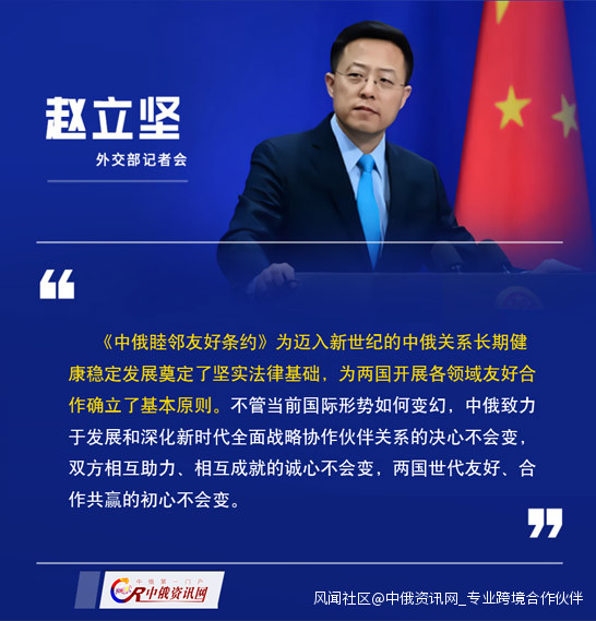 趙立堅強調,“不管當前國際形勢如何變幻,中俄致力於發展和深化新時代全面戰略協作夥伴關係的決心不會變,雙方相互助力、相互成就的誠心不會變,兩國世代友好、合作共贏的初心不會變。雙方將繼續攜手打造守望相助、互利共贏、民心相通、捍衞公平正義的典範。我們對新時代中俄關系的未來充滿信心。”