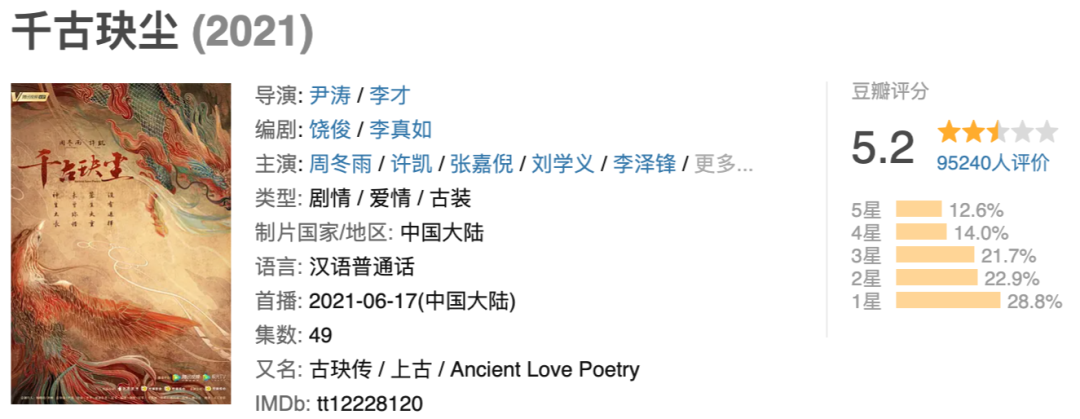 與吐槽幾乎同時而來的是豆瓣4.8的開分。在一些討論《千古玦塵》評分微博下的評論中,“壓根沒看”“也就值這個分”等類似的言論也經常出現,其中不少還佔據熱評前列。#千古玦塵 選角##千古玦塵豆瓣評分#等也登上微博熱搜。